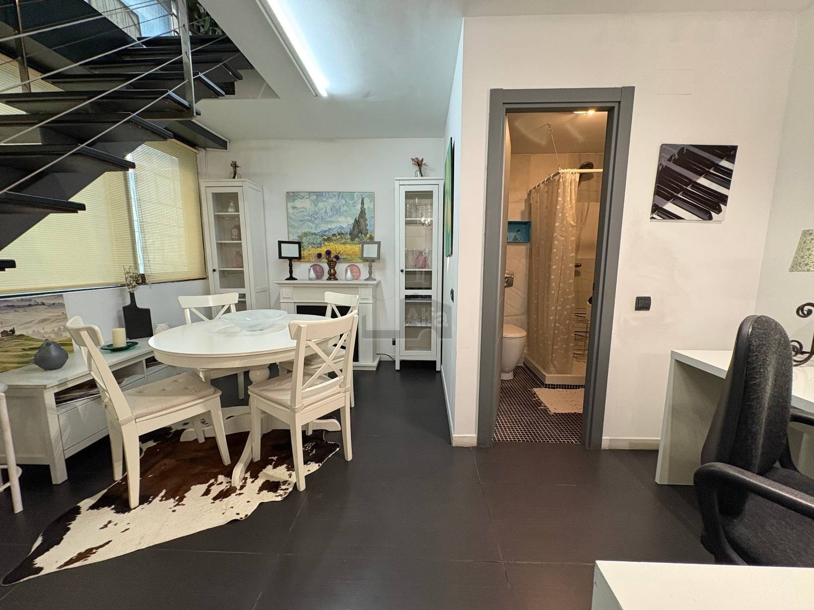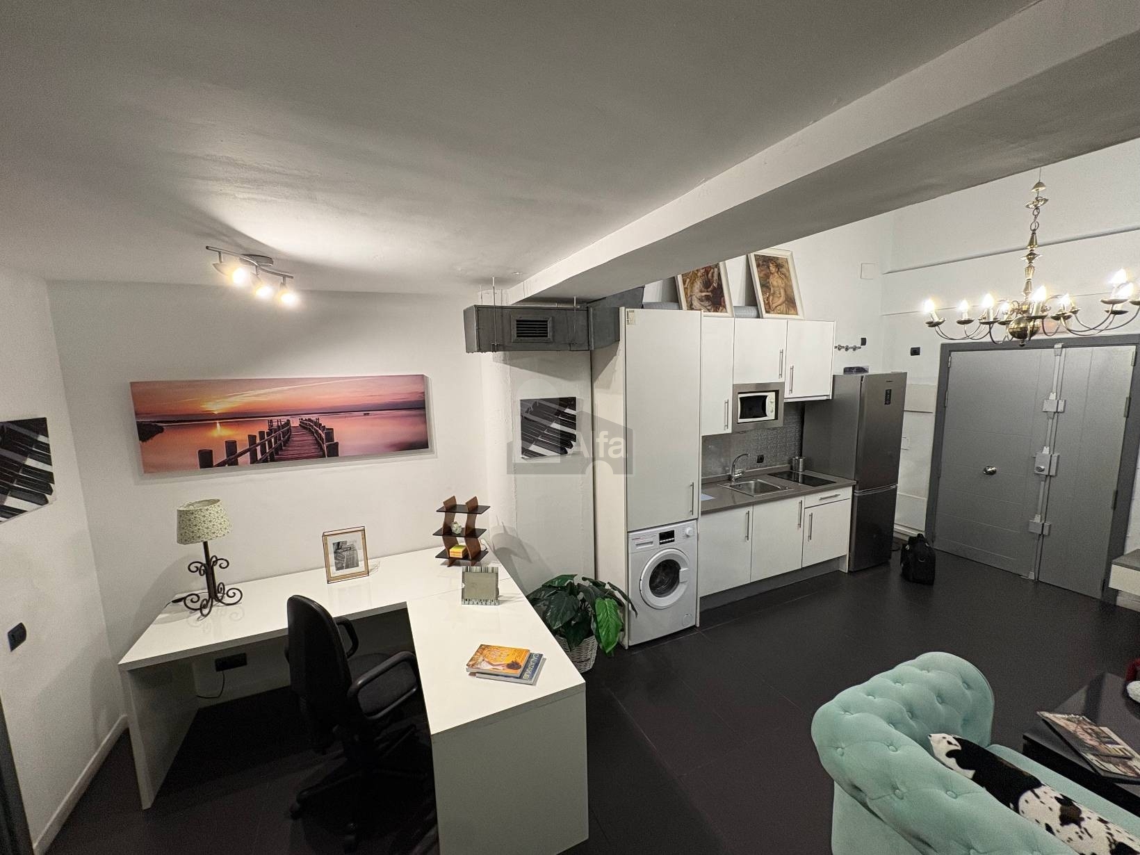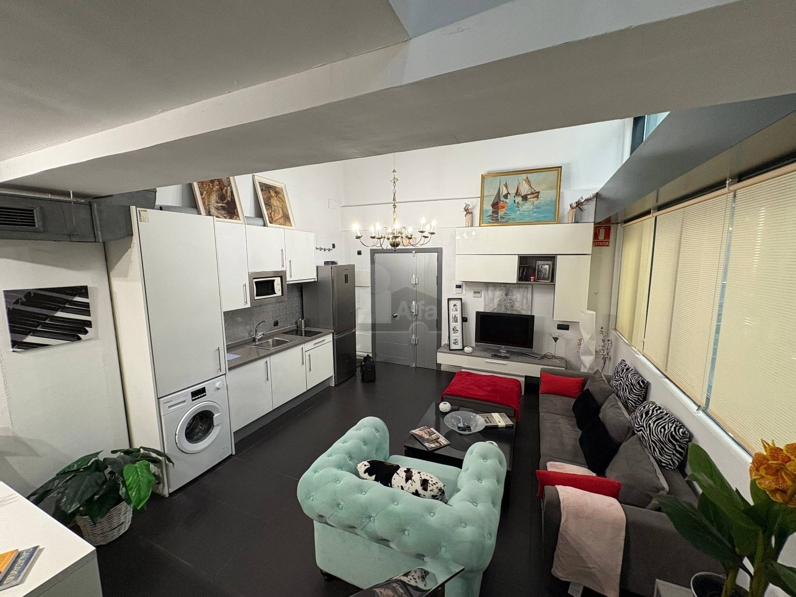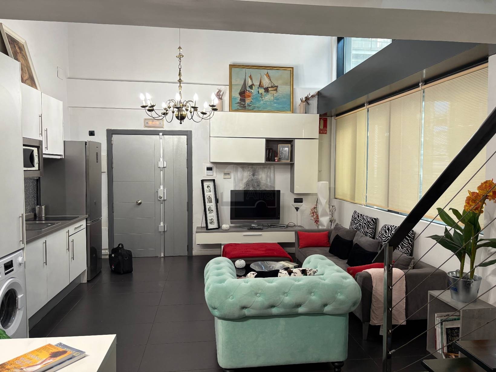 • Planta Principal: Un salón inundado de luz natural con cocina americana de concepto abierto, equipada con todos los electrodomésticos (frigorífico, lavadora, vitrocerámica y microondas). Incluye un baño completo con plato de ducha.